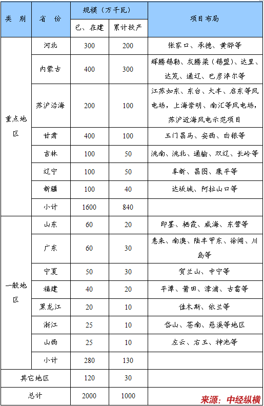 在经济较发达的江苏、上海、福建、山东和广东等沿海地区,发挥其经济优势和市场优势,加快开发利用风能资源,尤其在苏沪沿海连片建设大型风电场,形成百万千瓦级风电基地。到2010年,苏沪沿海地区风电装机容量达到100万千瓦以上。在风能资源和电力市场优良的地区建成数十个10万千瓦级的大型风电场。