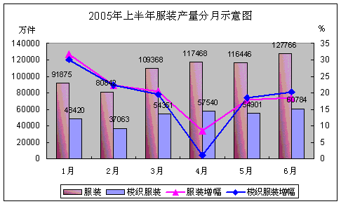 尽管国际市场的不确定性和复杂多变性给 行业 正常有序的发展蒙上了阴影,但内需强劲增长使得内需对产业的拉动作用远远大于出口。在外销市场不甚景气的情况下,2005年上半年全 行业 仍然完成服装产量超过200亿件。