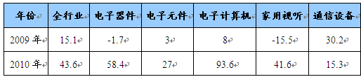 1-11月,家用视听、电子器件 行业 分别完成投资126和1439亿元,增速由去年同期下降15.5%和1.7%转为增长41.6%和58.4%,其中光电器件、电光源增速高达84.8%和73.4%。计算机 行业 完成投资503亿元,同比增长93.6%,增速比去年同期提高85.6个百分点,其中计算机外部设备增长122.9%。电子元件 行业 完成投资936亿元,增速由去年同期的3%提高至27%。通信设备 行业 受电信业投资平缓影响,增长15.3%,低于去年同期14.9个百分点。电子材料 行业 投资增速由去年同期的45.2%降至13.6%。