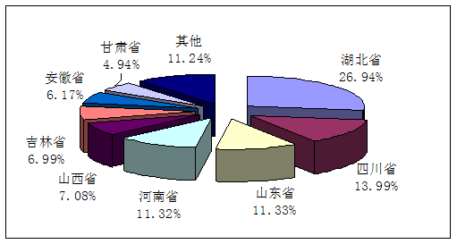 2004年国内麻袋产量出现负增长,年产4618万条,同比下降17.39%。除湖北、四川、贵州和甘肃外,其他产麻袋的省市产量都有所下降。湖北、四川、山东、河南四省麻袋产量共计2936万条,占总产量的63.58%;前八位省市产量占总产量的88.76%,可见麻袋生产具有较强的集中度。