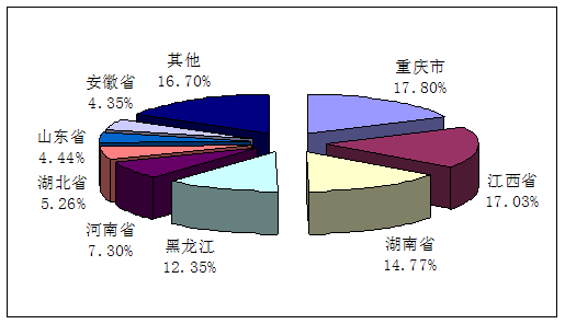 2004年苎麻布及亚麻布产量14351万米,比上年增长9.9%,部分地区产量增长较快,但也有很多地区产量下降。主产区重庆、江西、黑龙江都有不同程度的增长,但作为苎麻主要种植区的湖南产量同比下降19.29%,这四个省市产量共计8890万米,占总产量的61.95%。产量增长较快的地区有辽宁和安徽,增长率分别为83.85%、74.65%。