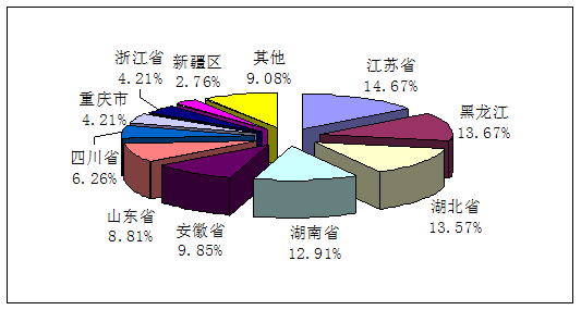 2004年,全国麻纺织业销售收入前十位的地区依次是:江苏省、黑龙江省、湖北省、湖南省、安徽省、山东省、四川省、重庆市、浙江省和新疆区。其中江苏省销售收入占全 行业 销售收入的14.67%,黑龙江省占13.67%,湖北省和湖南省分别占13.57%和12.91%,前四位地区合计占总销售收入的54.82%,而前十位地区销售收入占全 行业 总销售收入的90.92%。