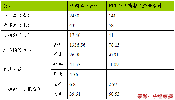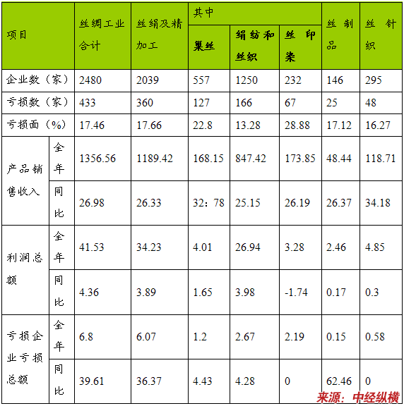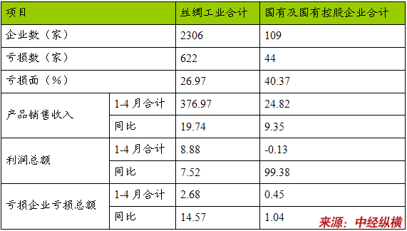 2005年1-4月丝绸工业产品销售收入完成376.97亿元,比去年同期增长19.74%,产品销售税金完成1.36亿元,比去年同期增加10.95%,利润总额完成8.88亿元,比去年同期增加7.52%,企业户数为2306个,亏损企业数622个,亏损面为26.97%,同比增加3.28个百分点,亏损企业亏损总额为2.68亿元,比去年同期增加14.57%。
