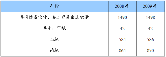 从对比表中可以看出,我国具有防雷设计、施工资质的防雷企业数量在不断增加,增加的主要为乙级、丙级资质企业,但增长速度较慢,仅增加了8家,按此推算,到2012年防雷设计、施工资质的防雷企业数量超过1520家,而到2012年防雷、接地 行业 的从业企业将达到有2600家以上。