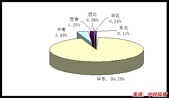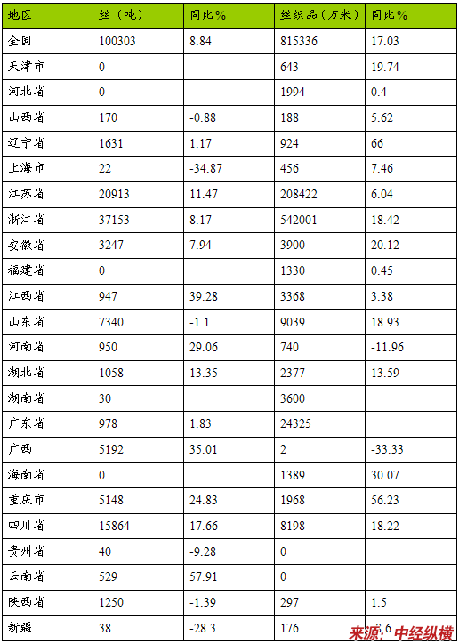 2004年丝织品产量815336亿米,同比增长17.03%。华东地区仍占有最大份额,高达94.26%;其次是中南地区和西南地区,年产丝织品量分别为32433亿米和10166亿米,相应占全国总量的3.98%、1.25%;而东北、华北、西北三个地区的份额均不到百分之一。