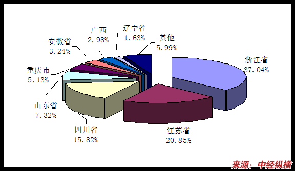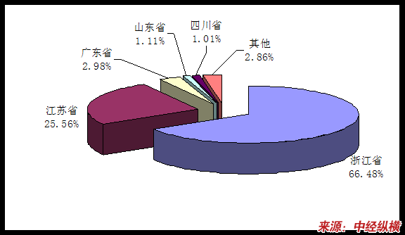 2004年,浙江省丝绸商品出口量达46.42亿美元,占全国出口总额的60.57%,较上年又提高了近10个百分点,浙江省丝绸产业在全国的强势地位得到强化。