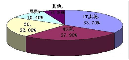 GPS销售渠道具有多元化的特点,调查统计数据表明用户在购买GPS设备时,主要通过途径有:It卖场、4S店、3C、网购等。其中,大约33.7%的用户会去IT卖场购买,主要原因在于GPS厂商大都是从传统数码领域转变过来,其渠道多以IT卖场为主,同时消费者也乐于接受这样的模式。也有27.9%的用户会选择去4S店购买,4S店相对于IT卖场的主要优势是有专业人士为消费者提供购买建议,而通过3C与网购的用户首选率分别为22.0%与10.4%。