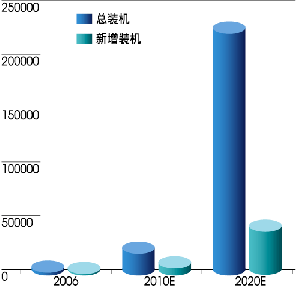 2006年,中国新增风电装机1337MW,占全球新增装机的8.9%,同比增长165.83%;至2006年中国风电累计装机达到2604MW,占全球风电装机的3.5%,累计装机增长105.29%。根据这个增速,中国的能源 规划 —至2010年风电装机达到5000MW,2020年达到30000MW的目标将轻易被突破。预计至2010年,中国风电累计装机可以达到20241MW,2020年可以达到224923MW,分别占到中国电力装机总量的2.02%和14.06%(下图)。