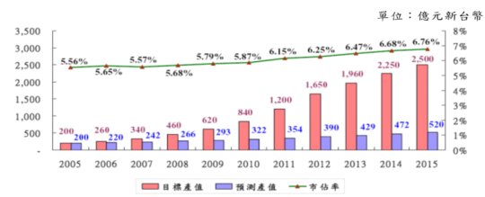 | 第二阶段 | 2009-2013 | 预估产值将达到新台币900亿元以上,以扩大产业规模为发展方向,扩大市场及产业规模化为推动目标,发展之产品领域以公共服务及照护服务为重点。 |