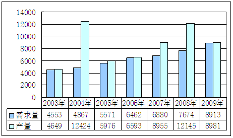 2003-2009年我国粮食烘干机产量、需求对比图