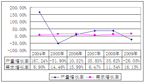 2004-2009年我国粮食烘干机产量、需求增长率对比图