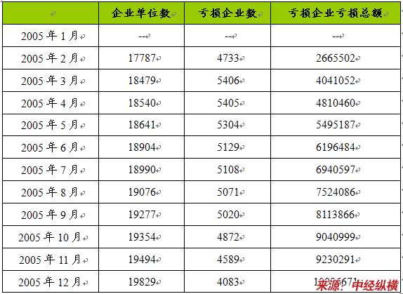 2005年1-12月生产企业单位数、亏损企业数、亏损企业亏损总额月度数据 单位:个,千元