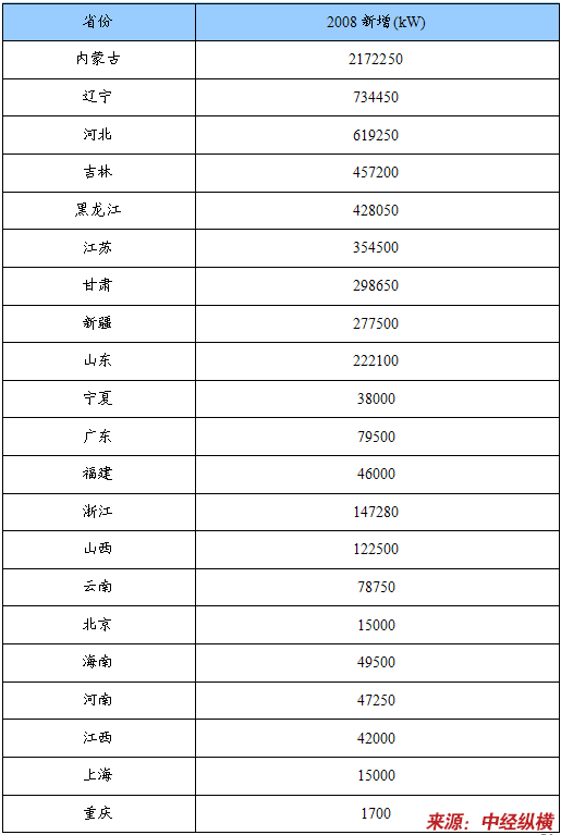 根据中国风能协会的统计数据,截止2008年底,全国累计装机规模约1215.3万kW,装机增长率为106%。装机分布在24个省(市、自治区),比2008年增加了重庆、江西和云南三个省市。累计装机容量排名前五位的省依次是内蒙古、辽宁、河北、吉林和黑龙江。