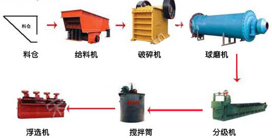 矿石——颚式破碎机破碎——皮带机输送——料仓——棒磨机磨矿——滚筒筛筛分——摇床重选——成品烘干。
