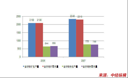 2007年,全球铬矿产量为2340万吨,相比2006年同比增长11.4%,其中68%用于本国铬铁生产;在需求方面,全球铬矿需求量为2310万吨,基本供求平衡。铬铁方面,2007年全球镍铁生产量为775万吨,同比增加20%;2007年全球铬铁需求量为766万吨,略小于产量。从全球的供需情况来看,供需基本已达平衡,如无下游需求的强烈刺激,铬矿和铬铁将会呈现供大于求的局面。