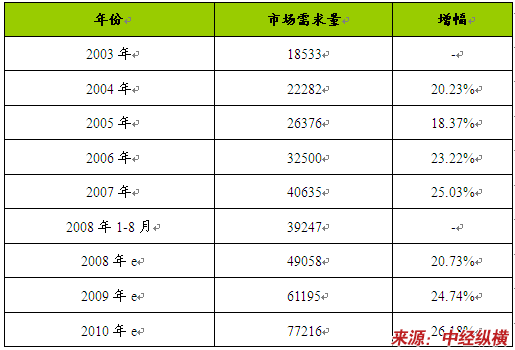 随着我国城市下水管路的不断改进,吸污车的需求将会受到影响,但是考虑到我国城镇化进程的不断加快,污水排放量的不断上升,吸污车市场的需求量将会保持快速的增长,同时受奥运会等因素的影响,2008年的需求将会出现突破性增长,需求将达到700台左右。随着城市下水管路的改进,未来需求量增速可能会放缓,2010年的需求量大概为900台左右。