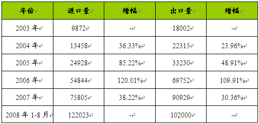 近些年我国环卫汽车 行业 的进出口数量都是非常大的,从2003年至2008年8月份的进出口数据来看,我国环卫汽车年进出口量的变化较为复杂。其中最为突出的是2006年,环卫汽车的进出口增长率都超过了100%。这样的增长幅度主要是由于受到国家环保政策的影响及2008年北京奥运会临近,国家加大了对环卫汽车 行业 的支持和对城市清洁工作的重视。这使得国内需求和产量都有了快速的提高,进口产品主要是以机械化程度较高的环卫汽车为主。