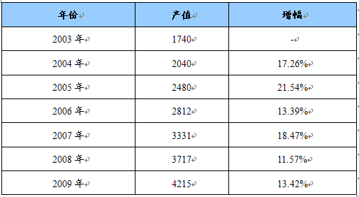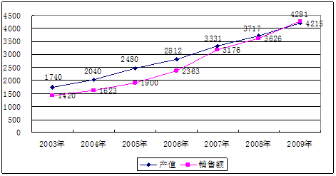 2003-2009年国内展柜产销情况对比图 单位:亿元