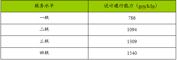 根据上述计算公式和各参数,计算得各级的单向单车道的设计通行能力如下所示: