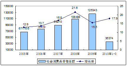 2009年,全年社会消费品零售总额125343亿元,比上年增长15.5%。2010年一季度,社会消费品零售总额36374亿元,同比增长17.9%,比上年同期加快2.9个百分点。