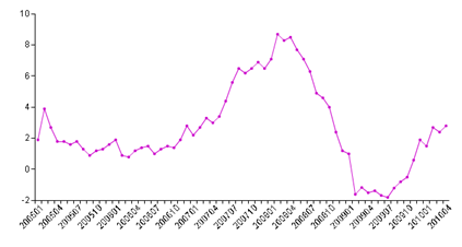 2009年,全年全部工业增加值134625亿元,比上年增长8.3%。规模以上工业增加值增长11.0%。2010年工业生产快速回升,企业效益大幅提高。一季度,全国规模以上工业增加值同比增长19.6%,比上年同期加快14.5个百分点。