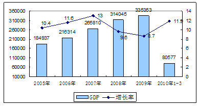 初步测算,2009年全年国内生产总值335353亿元,按可比价格计算,比上年增长8.7%,增速比上年回落0.9个百分点。2010年一季度国内生产总值80577亿元,按可比价格计算,同比增长11.9%,比上年同期加快5.7个百分点。