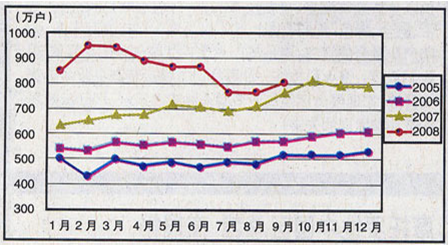 2005~2008年互联网用户各月净增比较