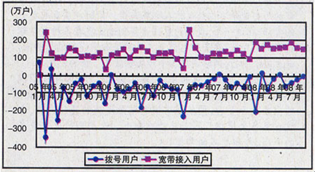(3)互联网用户:基础电信企业的互联网用户进一步趋向宽带化。2008年1~9月,互联网拨号用户减少421.3万户,达到1519.6万户,而互联网宽带接入用户净增1439.4万户,达到8080.8万户。