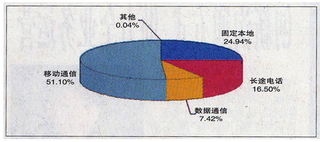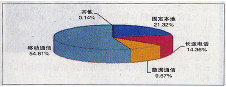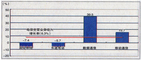2008年1~9月,移动通信收入和数据通信收入比去年同期分别增长15.7%和39.5%,在电信业务总收入中所占的比重比去年同期分别上升了3.51个和2.14个百分点。而固定本地电话业务收入比去年同期减少7.4%,在电信业务总收入中所占的比重比去年同期下降了3.62个百分点。