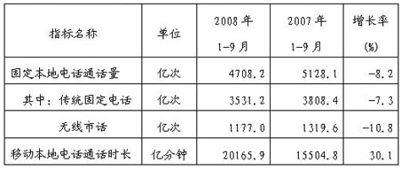 2008年1~9月,固定本地电话通话量比去年同期下降8.2%,而移动本地电话通话时长比去年同期增长30.1%。