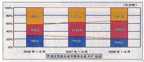 2008年1~9月,长途电话通话总时长达到3147.3亿分钟,比去年同期增长4.1%。其中固定传统长途、IP电话通话时长分别下降17.1%、5.8%,而移动长途电话通话时长增长28.9%。