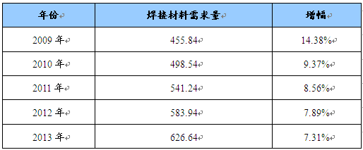 焊接材料市场是以钢材消费量为基础的,随着钢材消费量的增加而增加。预计到2010年我国焊接材料消耗量可能接近400万吨。可见在未来几年,我国焊接材料市场是相当大的。而在今后一定时期我国焊接材料需求量将随着国际产业结构的调整而迅速增长,我国将成为世界范围内的焊接材料产业大国之一。