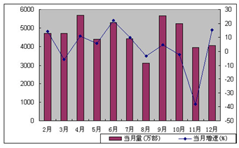 2008年1-12月我国手机每月生产及增速情况