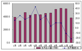 2008年1-12月我国手机每月出口及增速情况