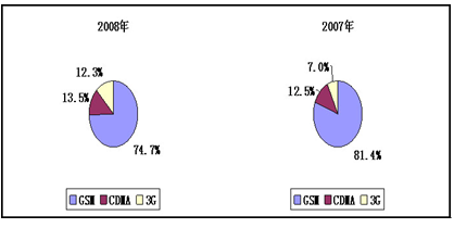 2008年,部监测的百家重点手机生产企业中,GSM手机产量同比下降17.1%,销售同比下降15.4%,产销占全 行业 比重分别为74.7%、75.4%,比2007年底分别下降了6.7、6.5个百分点。运营商的重组对CDMA手机产销产生一定的影响,CDMA手机产量同比增长15.4%,销量同比增长15.2%,产销比重为13.5%、13.4%,比2007年底均提高了1个百分点。3G手机产销快速增长,随着4月份TD-SCDMA开始试商用,以及国际市场需求增加,拉动3G手机产销快速发展,全年共生产3G手机6579万部,同比增长87.5%,销售6637万部,同比增长90%;占 行业 比重为12.3%,比2007年增长了5.3个百分点。从中国移动公布的TD-SCDMA终端招标结果看,包括酷派、熊猫、华为、中兴、联想、海信、新邮通、华立等国内八家厂商的3G手机均已获得入网许可证,国内手机占比将进一步提高。