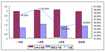 2008年我国手机生产与全球出货量比较(亿部)