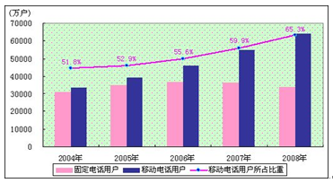 2008年,全国电话用户净增6909.2万户,总数达到98203.4万户。移动电话用户在电话用户总数中所占的比重达到65.3%,移动电话用户与固定电话用户的差距超过3亿户。