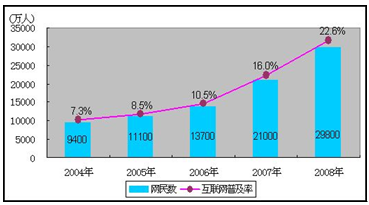 2004-2008年网民数和互联网普及率