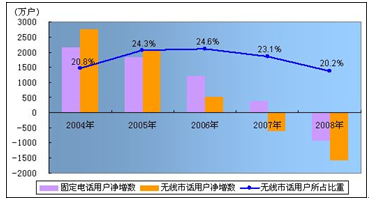 2008年,全国固定电话用户减少2483.2万户,达到34080.4万户。其中,城市电话用户减少1660.2万户,达到23199.5万户;农村电话用户减少823.0万户,达到10881.0万户。固定电话普及率达到25.8部/百人,比上年底下降2.0部/百人。