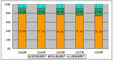 2004-2008年公用、政企、住宅电话用户所占比重