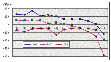 2006-2008年固定电话用户各月净增比较