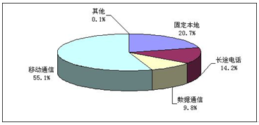 2008年,全国电信业务收入累计完成8139.9亿元,同比增长7.0%。其中,移动通信网业务收入4485.9亿元,同比增长15.1%,占电信业务收入的比重为55.1%;固定本地电话网业务收入1685.7亿元,同比下降9.4%,占电信业务收入的比重为20.7%;长途电话网业务收入1159.0亿元,同比下降7.0%,占电信业务收入的比重为14.2%;数据通信网业务收入798.4亿元,同比增长35.1%,占电信业务收入的比重为9.8%。