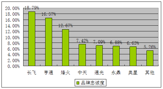 通过对品牌忠诚度的调查,我们发现消费者对长飞的品牌忠诚度最高,达18.79%,其次是亨通、烽火、中天等,具体情况如下图: