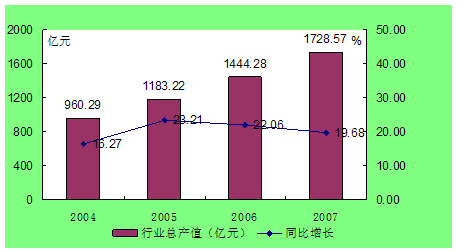 2007全年全部工业增加值107367亿元,比上年增长13.5%。规模以上工业增加值增长18.5%,其中国有及国有控股企业增长13.8%;集体企业增长11.5%,股份制企业增长20.6%,外商及港澳台投资企业增长17.5%;私营企业增长26.7%。分轻重工业看,轻工业增长16.3%,重工业增长19.6%。