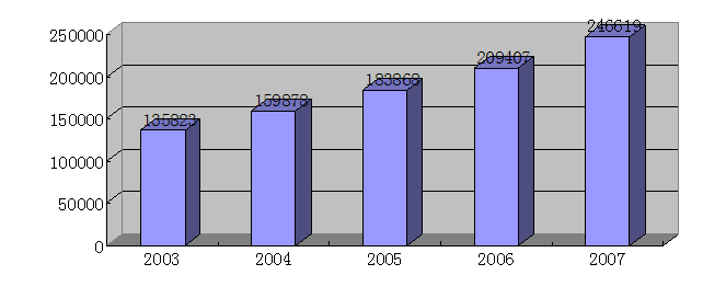 2007年国民经济保持高速平稳增长的态势。2007年国内生产总值246619亿元,比上年增长11.4%。分产业看,第一产业增加值28910亿元,增长3.7%;第二产业增加值121381亿元,增长13.4%;第三产业增加值96328亿元,增长11.4%。第一产业增加值占国内生产总值的比重为11.7%,与上年持平;第二产业增加值比重为49.2%,上升0.3个百分点;第三产业增加值比重为39.1%,下降0.3个百分点。分季度看,一季度增长11.1%,二季度增长11.9%,三季度增长11.5%,四季度增长11.2%。