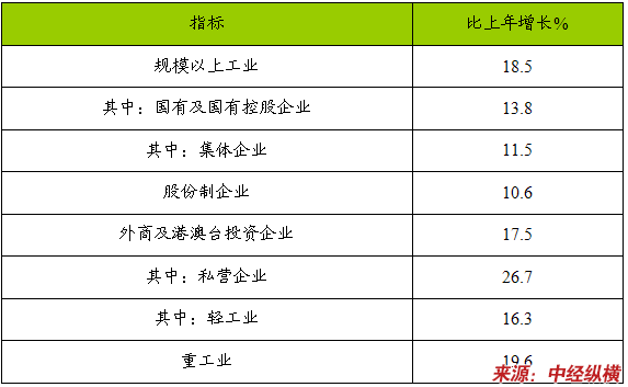全年规模以上工业中,煤炭开采和洗选业增加值比上年增长18.1%,石油和天然气开采业增长3.9%,纺织业增长16.2%,农副食品加工业增长16.9%,通用设备制造业增长24.2%,交通运输设备制造业增长26.2%,通信设备、计算机及其他电子设备制造业增长18.0%,电气机械及器材制造业增长21.5%。6大高耗能 行业 比上年增长18.9%,其中,非金属矿物制品业增长24.7%,黑色金属冶炼及压延加工业增长21.4%,化学原料及化学制品制造业增长21.0%,有色金属冶炼及压延加工业增长17.8%,电力热力的生产和供应业增长13.8%,石油加工炼焦及核燃料加工业增长13.4%。高技术产业增加值比上年增长17.8%。