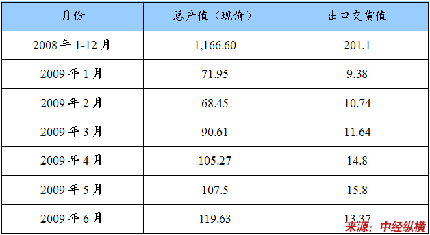 2009年上半年,全国规模以上船舶工业企业1792家,完成工业总产值2561亿元,同比增长36.7%,增幅下降21.4个百分点。其中船舶制造业1955亿元,同比增长43%,增幅下降8.4个百分点;船舶配套业279.5亿元,同比增长42.3%,增幅下降44.6个百分点。