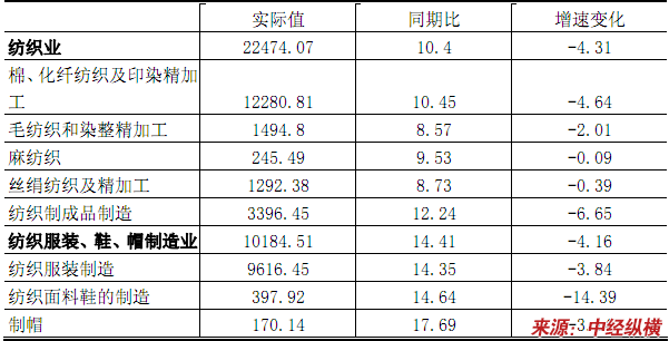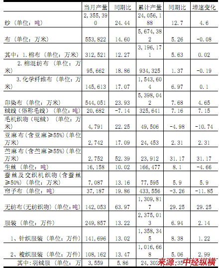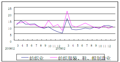 在国家“保增长、扩内需、条结构”一系列宏观调控政策下,我国纺织 行业 逐渐走出困境,呈现企稳回升、逐季加快态势,全年工业增加值增长8.5%,增幅比上年下降2个百分点,但比前三季度、上半年、一季度加快0.9、1.2、2.4个百分点;二服装 行业 受国际市场持续低迷的影响,发展状况不容乐观,全年工业增加值增长9.9%,增幅比上年下降2.6个百分点。