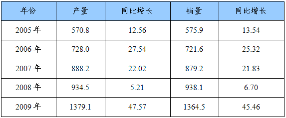 进入2009年,我国汽车产销情况开始好转,2009年国产汽车产销突破1300万辆,同比增长创历年最高,乘用车产销首次超过1000万辆,商用车总体呈良好表现。2009年汽车工业的迅猛发展,使我国成为世界第一汽车生产和消费国。
