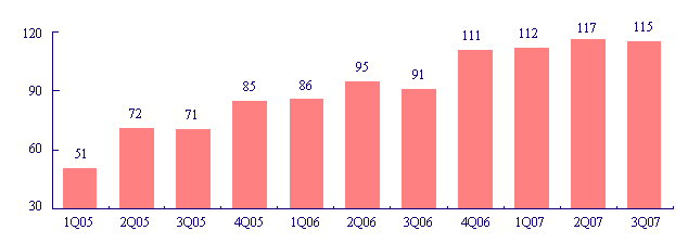 从季度数据看,2005年一季度轿车单季销量为50万辆,之后每两个季度上一个台阶。经过8个季度快速增长,轿车季度销量达到115万辆水平。季度数据反映轿车销量增长的基础是扎实的。